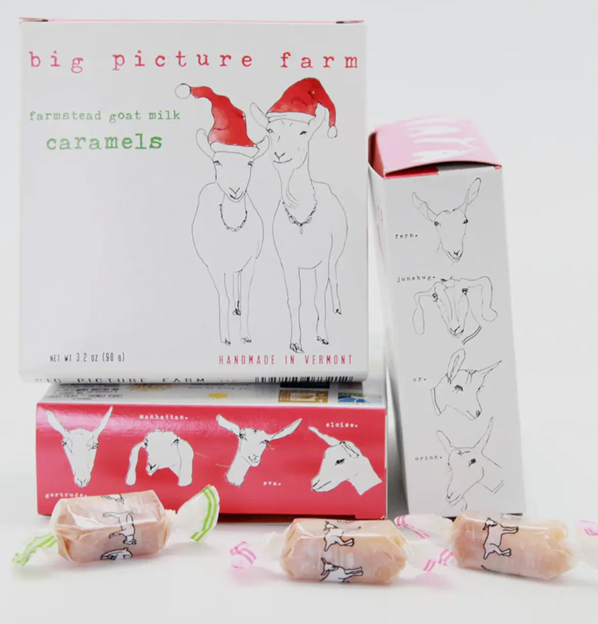The perfect tasty Christmas treat! Big picture farm’s goat milk caramel’s box are darling and taste delicious! Each box contains an assortment of 8 different flavors