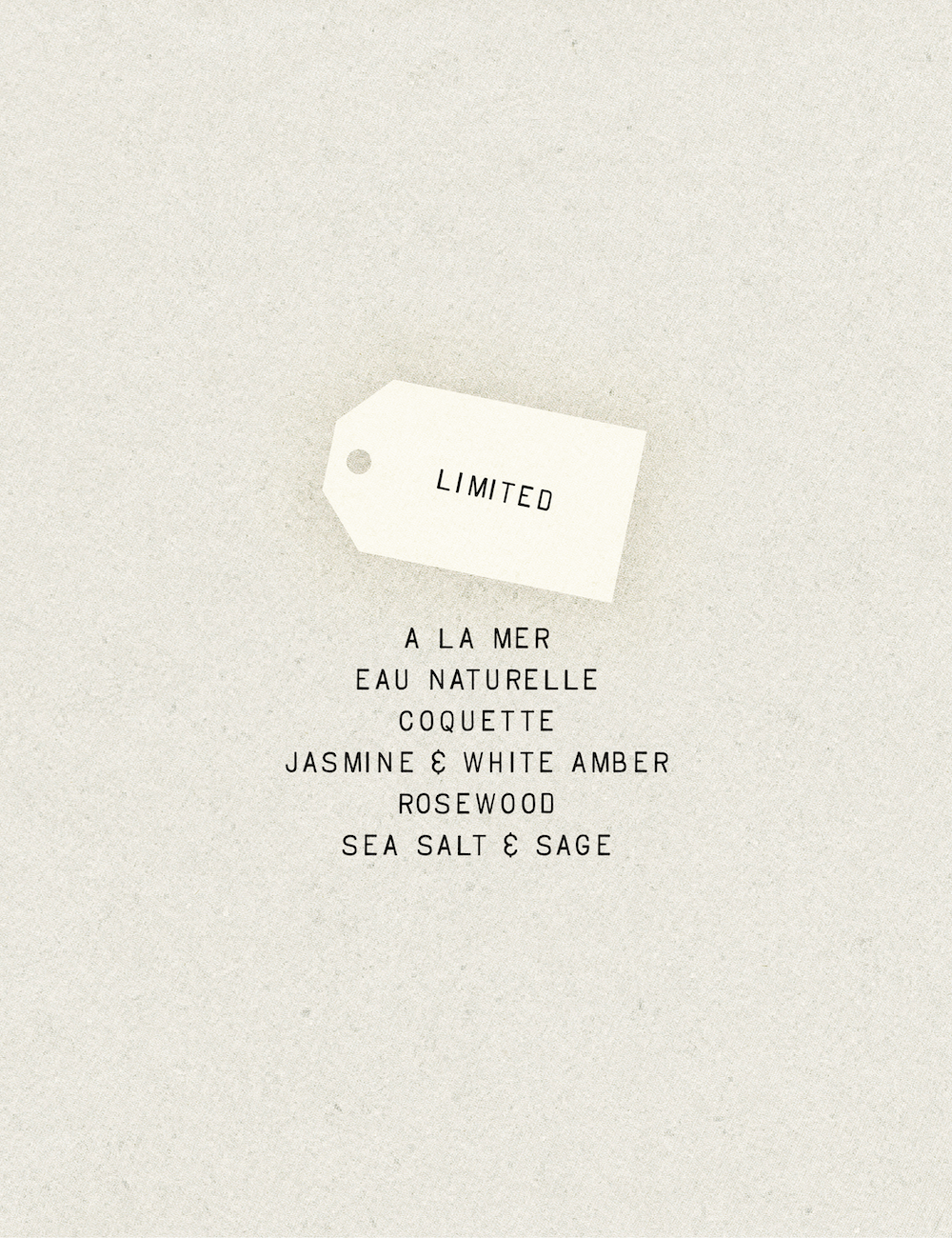 Limited Edition Fragrances: A La Mer, Eau Naturelle, Coquette, Jasmine & White Amber, Rosewood, Sea Salt & Sage